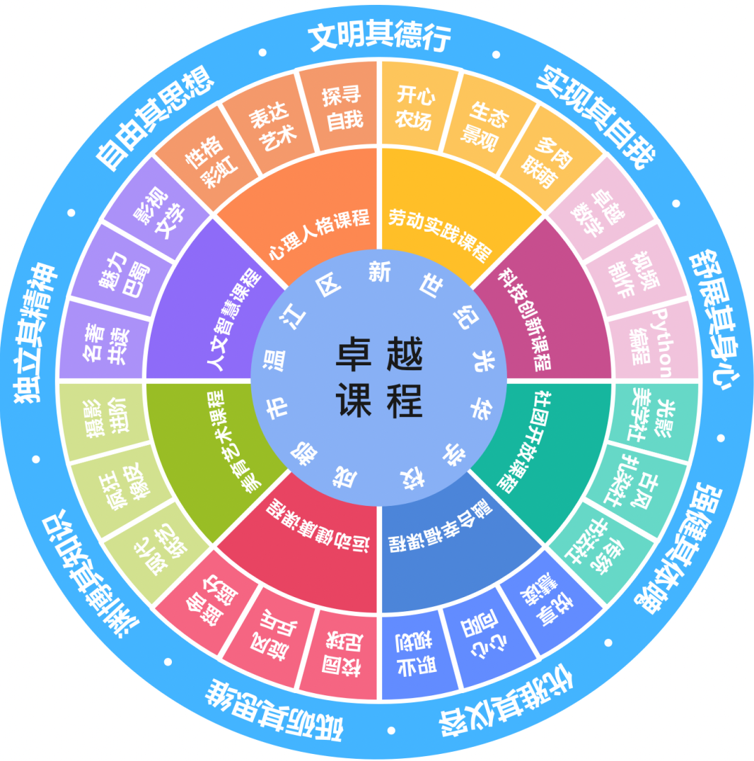 我校“卓越课程”由校本课程“格致课程”升级而成,根据国家的教育方针和课程方(2022年版)、地方课程的要求、学校的办学方向和学生的特点进行优化,仍然坚持国家课程不可动摇,实现国家课程校本化,地方课程特色化,校本课程多元化,力争做到“四个结合”,即显性课程和隐性课程相结合,长期课程与短期课程相结合,讲授课程与活动课程相结合,教师主导课程与学生自主课程结合,有效地拓展国家课程的深度和宽度。卓越课程构架了专业的课程体系,共建立了八大课程:心理人格课程、劳动实践课程、科技创新课程、社团开放课程、融合幸福课程、运动健康课程、美育艺术课程、人文智慧课程。